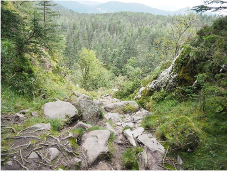 The well-defined gravel track degenerated into a vague path down the mountain through the